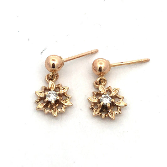 Vintage 14K Yellow Gold Diamond Starburst Snowflake Flower Dangle Stud Earrings