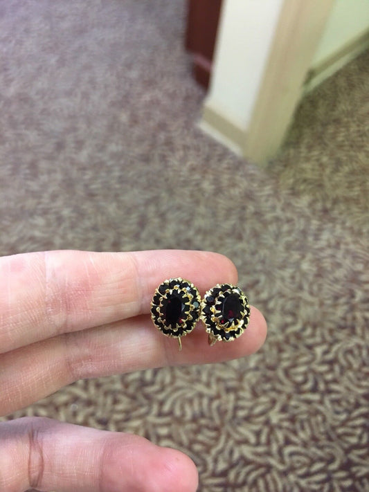 Vintage 14K Yellow Gold Oval Garnet Cluster Screw Back Earrings