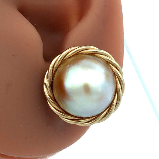 Estate 14K Yellow Gold Round Mabe Pearl Bird's Nest Statement Stud Earrings