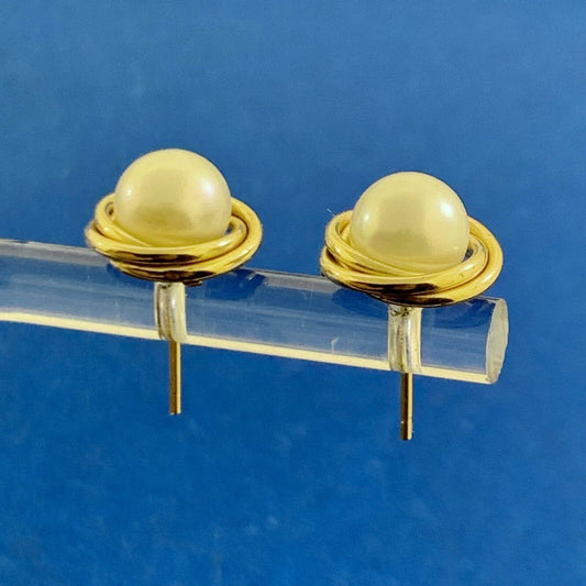 Vintage 14K Yellow Gold Pearl Modernist Bird Nest Stud Earrings