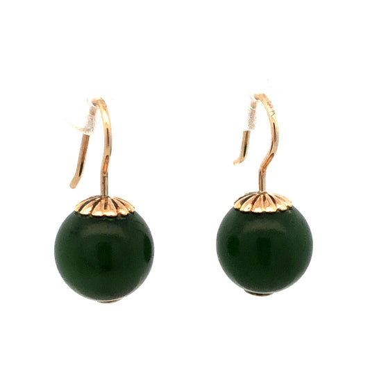 Estate 14K Yellow Gold Round Jade Ball Hook Dangle Earrings
