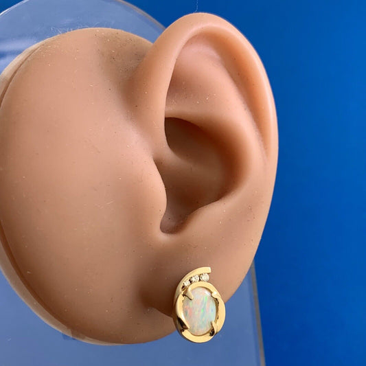 Estate 14K Yellow Gold Oval White Opal Cabochon Solitaire Stud Earrings