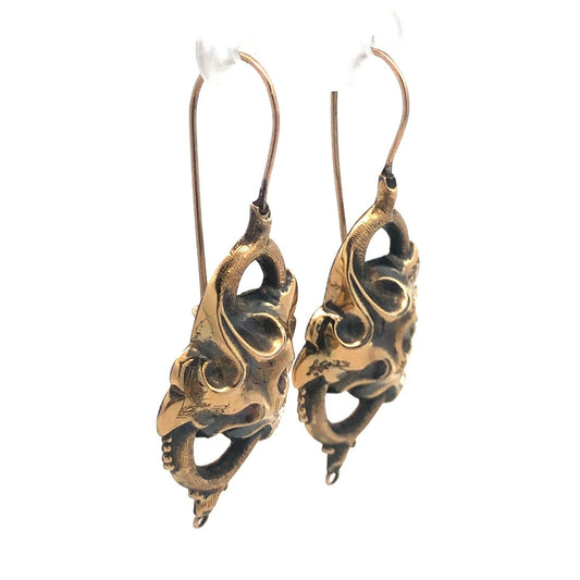 Modernist 10k Yellow Gold Abstract Floral Scroll Drop Dangle Hook Earrings