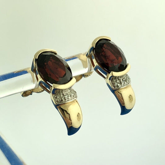 Gorgeous 10k Yellow Gold Oval Garnet Diamond Accent Modern Statement Earrings