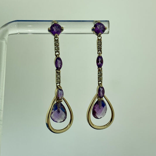 Designer 10K Yellow Gold Amethyst Diamond Accented Drop Dangle Stud Earrings