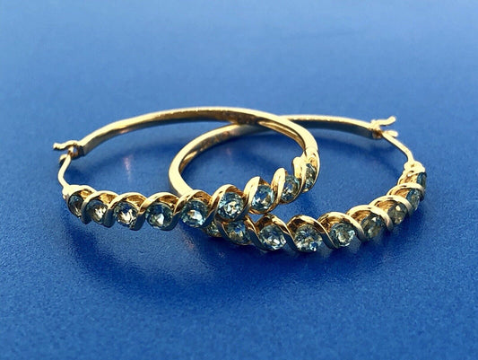 Retro 10K Yellow Gold Blue Topaz December Anniversary 2.ctw Hoop Earrings