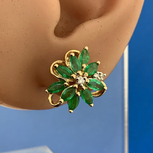 Designer 10K Yellow Gold Marquise Emerald Diamond Accented Floral Stud Earrings