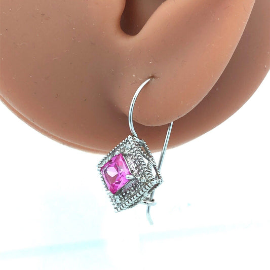 Designer 10K White Gold Princess Pink Sapphire Diamond French Hook Earrings