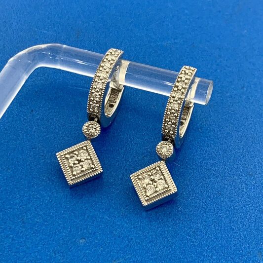 10K White Gold Diamond LOVE Dangle Drop Earrings