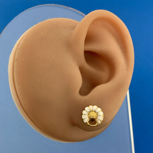 Vintage 10K Yellow Gold White Enamel Petite Flower Screw Back Stud Earrings