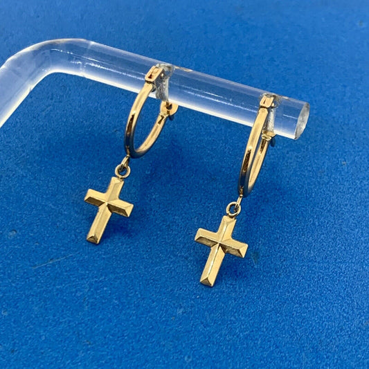 Designer 10K Yellow Gold Cross Dangle Huggy Hoop Earrings