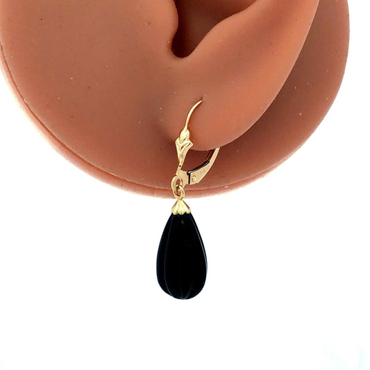 Designer 14K Yellow Gold Ribbed Onyx Pear Drop Dangle Leverback Earrings