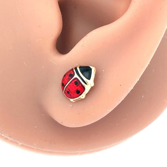 Designer JCM 14KT Yellow Gold Red Black Enamel Lady Bug Stud Earrings
