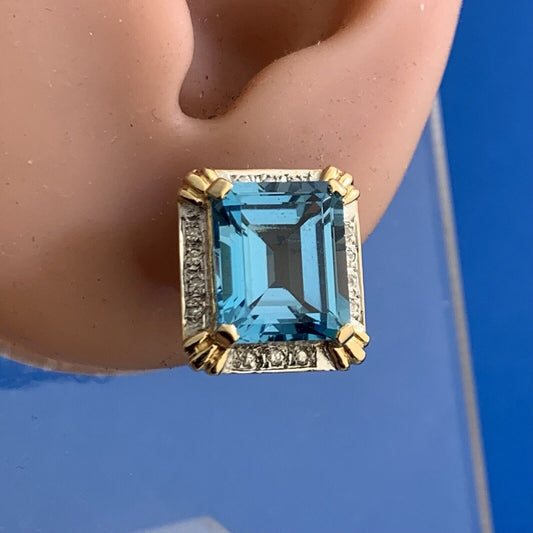 Designer 14K Yellow Gold Emerald Cut Blue Topaz Diamond Halo Omega Back Earrings