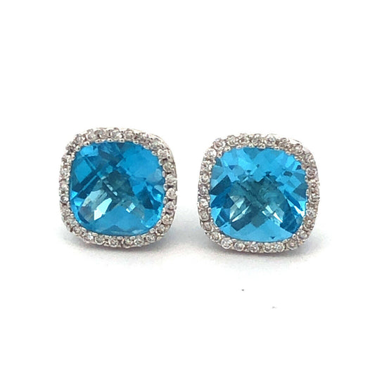 18K White Gold Square Cushion Cut Blue Topaz White Topaz Accents Stud Earrings