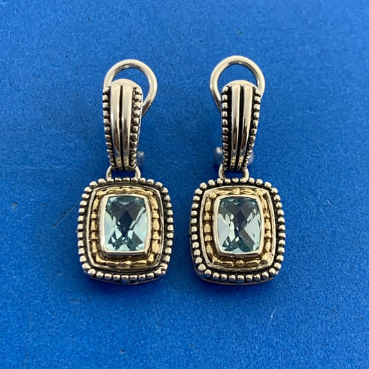 Designer Sterling Silver 14K Yellow Gold Princess Blue Topaz Omega Back Earrings