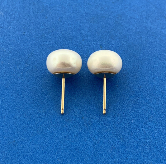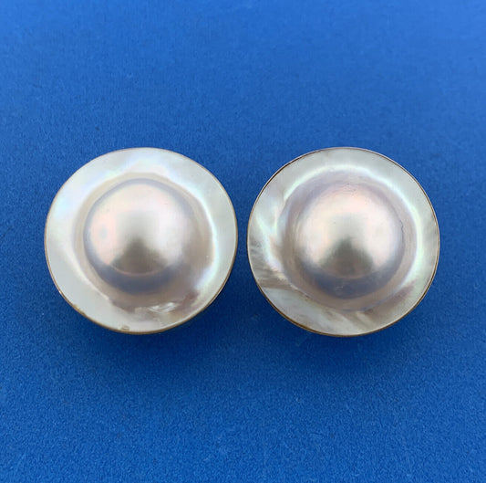 Gorgeous 14k Yellow Gold Large White Blister Mabe Pearl Omega Back Stud Earrings