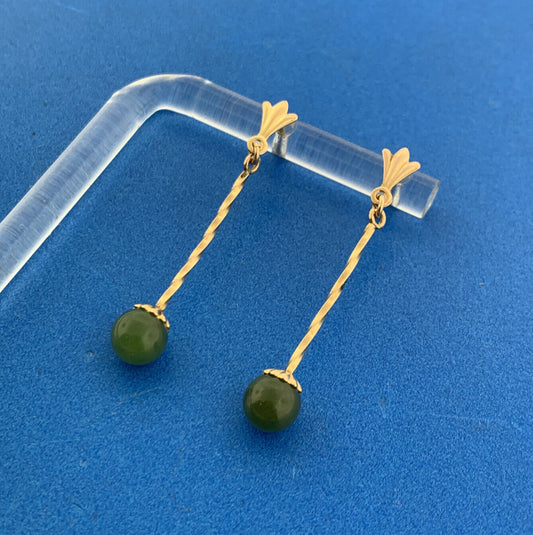 Vintage 14K Yellow Gold Jade Jadeite Ball Bead Dangle Drop Stud Earrings