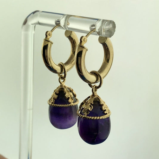 Gorgeous 14k Yellow Gold Amethyst Pear Floral Dangle Hoop Statement Earrings
