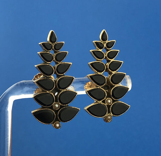 Vintage 14k Yellow Gold Onyx Inlay Seed Pearl Fern Leaf Screw Back Earrings