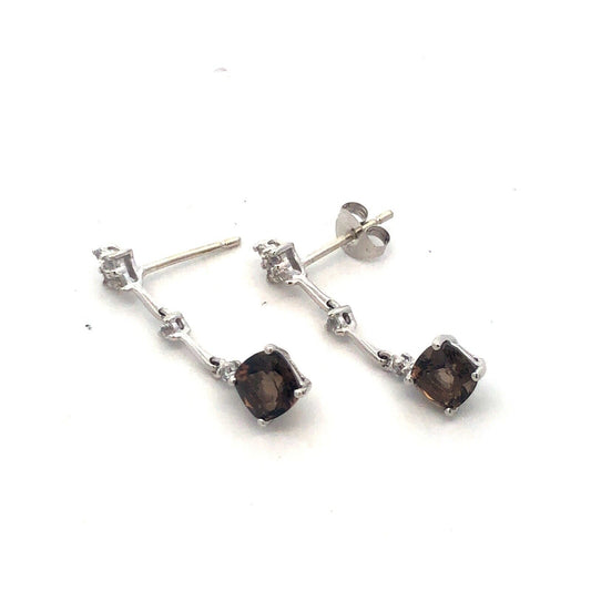 Gorgeous 14k White Gold Cushion Smoky Quartz White Accent Dangle Stud Earrings