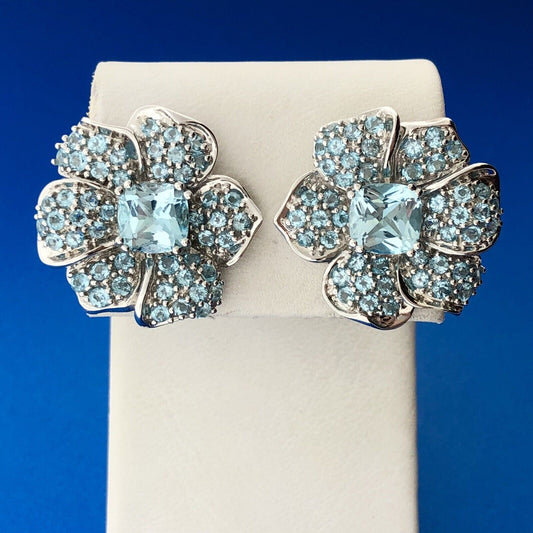 14K White Gold Blue Topaz Flower Poppy Cluster December Occasion Earrings