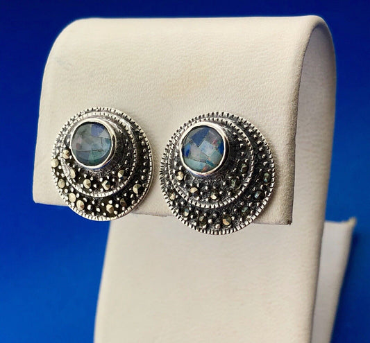 Vintage Sterling Silver Opal Mosaic Cabochon Marcasite Statement Stud Earrings
