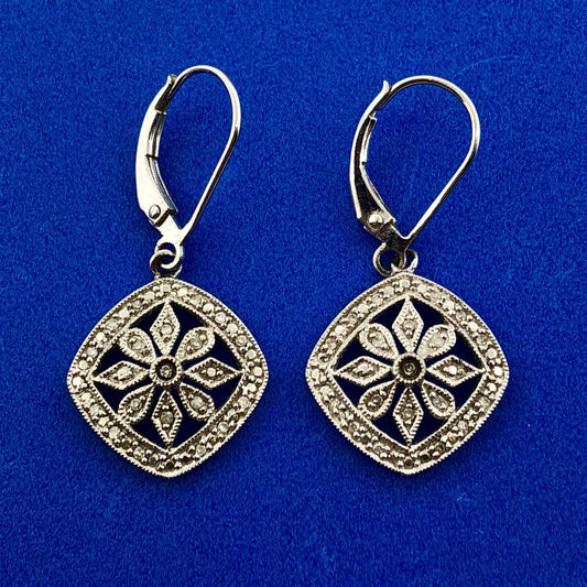 Designer Sterling Silver 925 Diamond Snowflake Flower Cluster Dangle Earrings