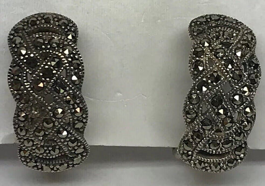 Art Deco 925 Sterling Silver Marcasite Open Work Basket Weave Clip Earrings