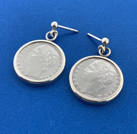 Stunning Sterling Silver 925 Italian Republic 1992 Coin Stud Dangle Earrings