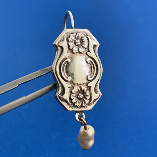 Vintage Pearl Dangle 925 Sterling Silver Floral Panel Hook Lever-back Earrings