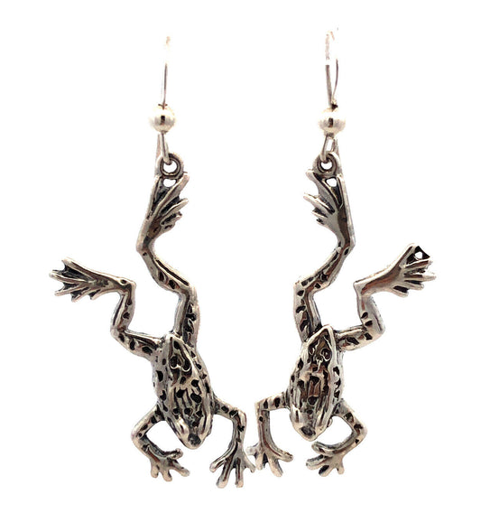 Vintage Designer Sterling Silver Frog Toad Textured Drop Dangle Hook Earrings
