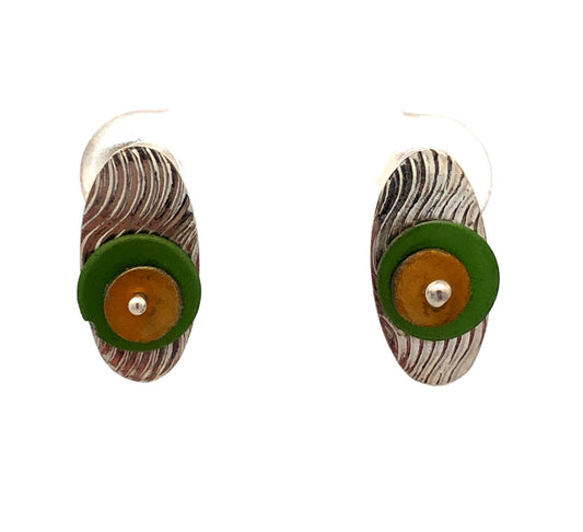 Vintage Hut 925 Sterling Silver Green Yellow Modernist Oval Stud Earrings