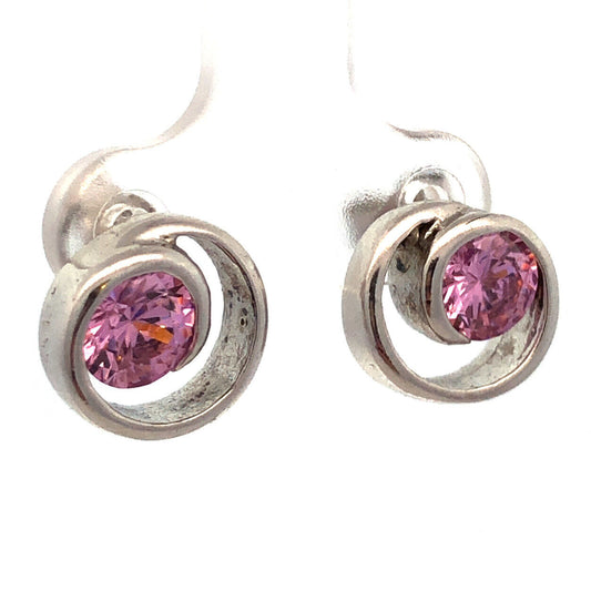 925 Sterling Silver Round Pink Tourmaline Solitaire Swirl Stud Earrings