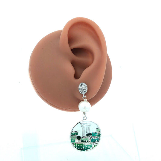 Vintage Casa De Oro 925 Sterling Silver Pearl Enamel Round City Dangle Earrings