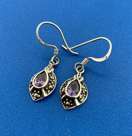 Designer 925 Sterling Silver Pear Amethyst Marcasite February Occasion Earrings