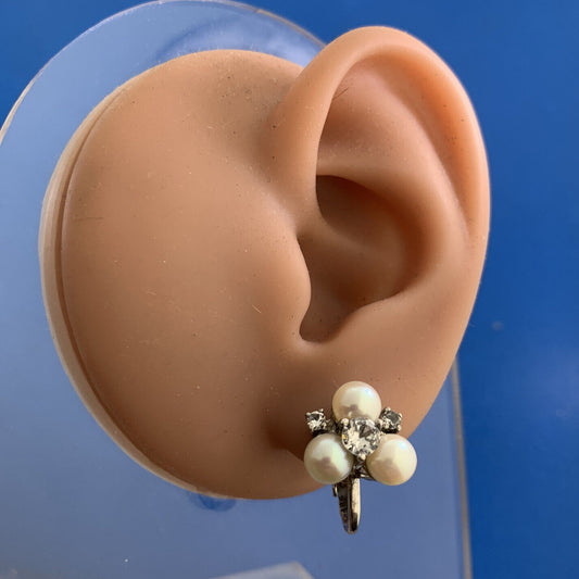 Vintage 925 Sterling Silver Pearl White Topaz Cluster Clip-on Stud Earrings