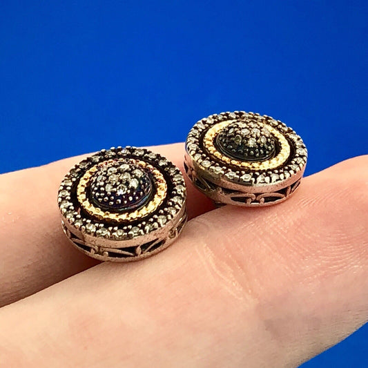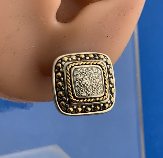Designer EFFY Sterling Silver 18K Gold Pave Diamond Square Omega Back Earrings