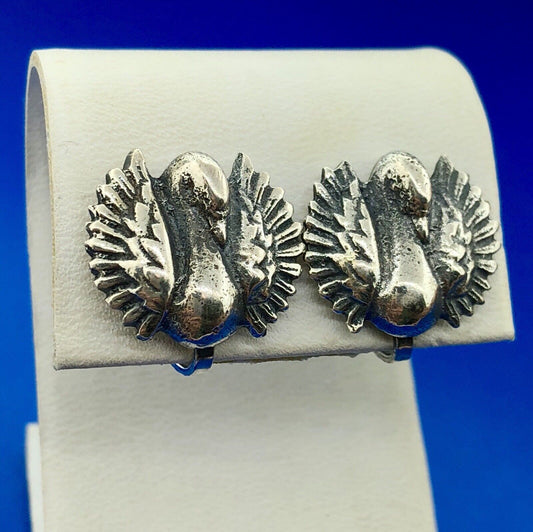 Art Deco Art Nouveau Artisan 925 Sterling Silver Swan Screw Back Earrings