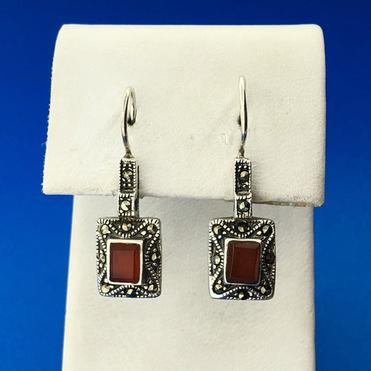 Vintage Designer 925 Sterling Silver Carnelian Marcasite French Hook Earrings