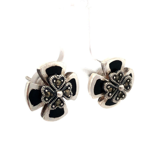 Estate Sterling Silver Black Onyx Inlay Marcasite 4 Leaf Clover Stud Earrings