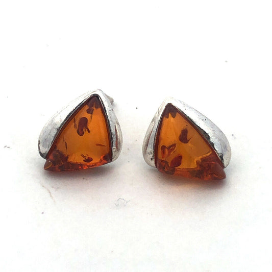Modernist 925 Sterling Silver Amber Trillion Cabochon Stud Earrings