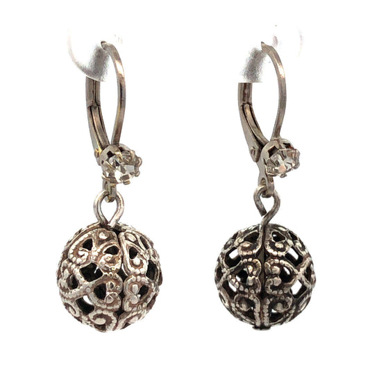 Vintage 925 Sterling Silver Round Cubic Zirconia Ball Dangle Hook Earrings