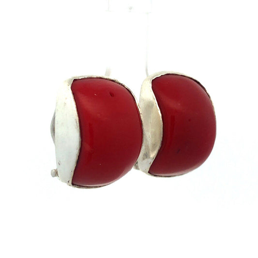 Vintage 925 Sterling Silver Rectangle Cabochon Red Coral Omega Stud Earrings