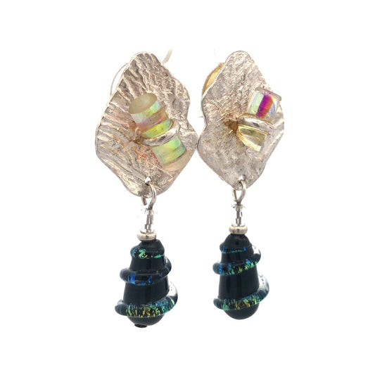 Vintage 925 Sterling Silver Black Onyx Crystal Dichroic Glass Dangle Earrings