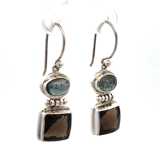 Vintage 925 Sterling Silver Cushion Cut Smokey Quartz Blue Tourmaline Earrings