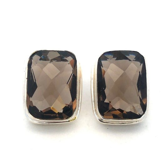 Vintage 925 Sterling Silver Rectangle Cushion Cut Smokey Quartz Stud Earrings