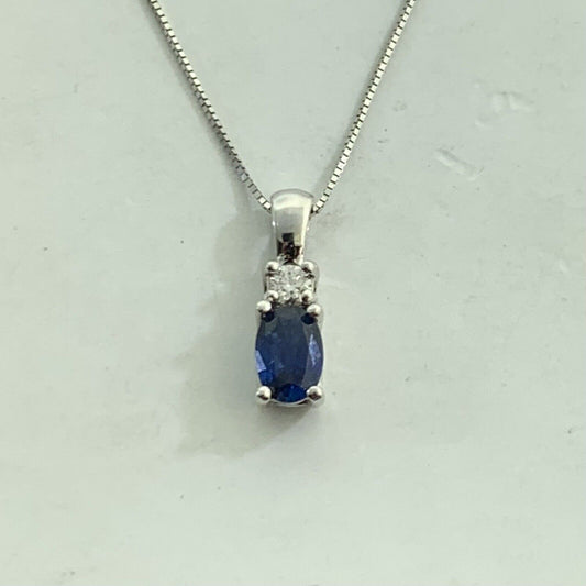 Designer 14K White Gold Oval Sapphire Round Diamond Petite Pendant Necklace