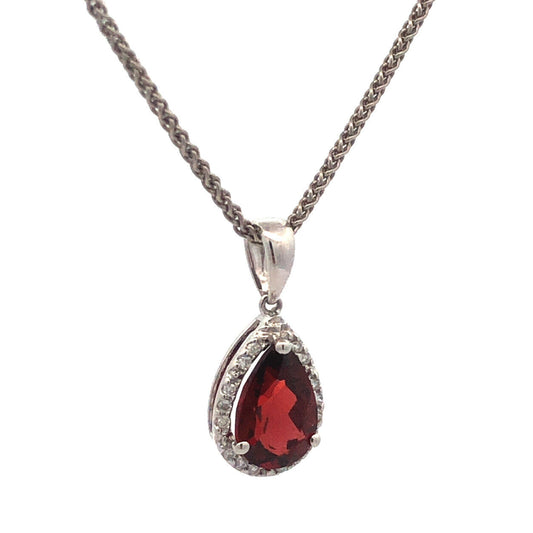 Designer 14K White Gold Pear Garnet Diamond Halo Drop Pendant Necklace