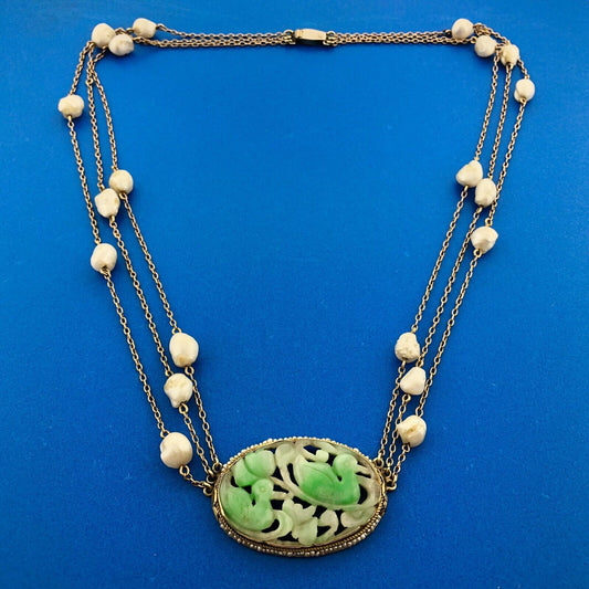 14k Yellow Gold Carved Jade White Pearl 18" 3 Strand Swimming Duck Necklace